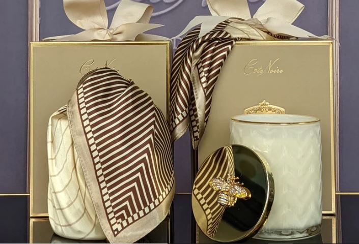 Limited-edition herringbone candles come in a decorative herringbone glass, adorned with an elegant Côte Noire gift box with a silk feel scarf.