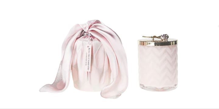 Fragrance: Charente Rose / Rose Des Charentes natural rose with top notes of rose petals, middle notes of rose leaf, and base notes of white unlimited-edition herringbone candles come in a decorative herringbone glass, adorned with an elegant Côte Noire gift box with a silk feel scarf.