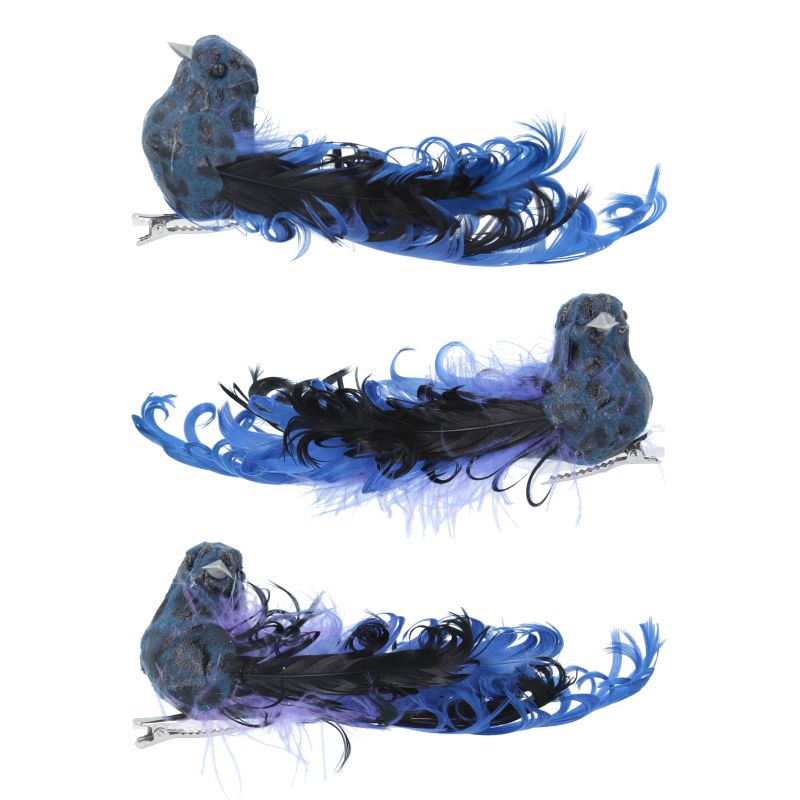 Blue Glitter/Curled Feather Bird Clip, 3as