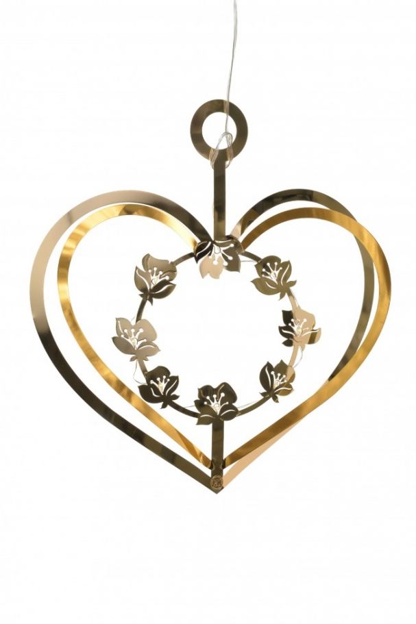 <p>Голямо златно сърце в огъващ се метал с венец за цветя и с малка LED-светлина във всяко цвете. Сгънете всеки метален лък леко, за да придадете на сърцето триизмерен вид.Включена копринена панделка.</p>