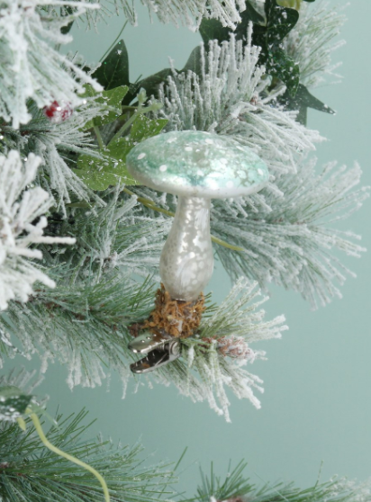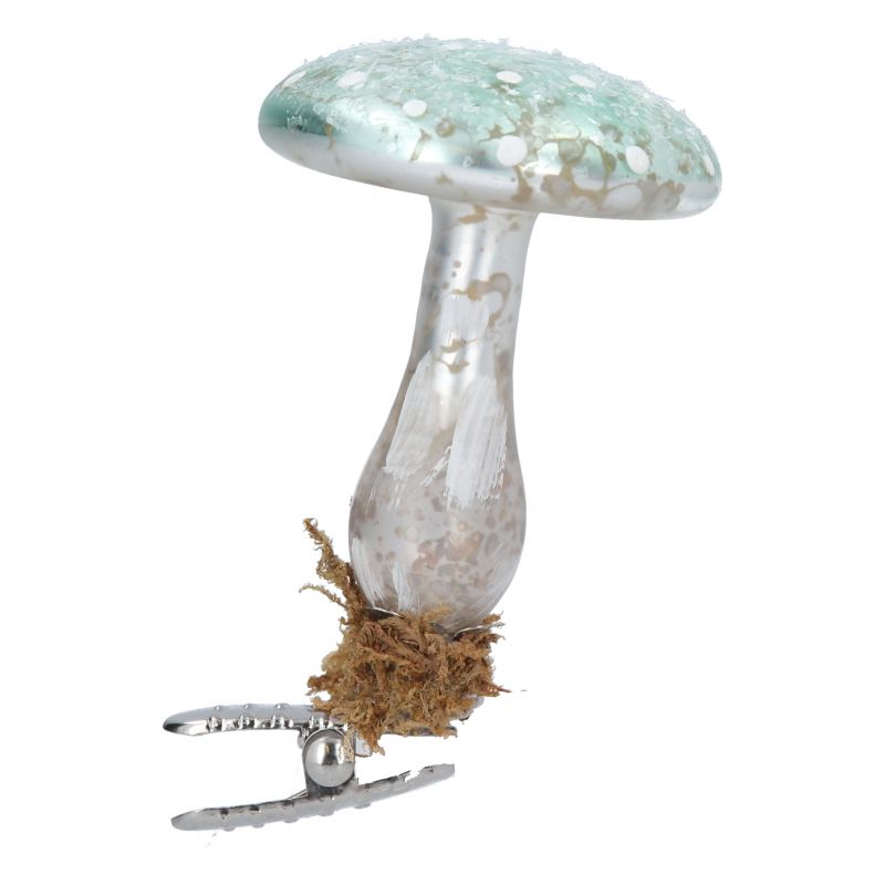 Красива бледозелена и бяла гъба с щипка за декорация. Перфектното допълнение към всяко коледно дърво. Модерен класически дизайн, който се закача направо към клоните на дървото ви. Изработен от стъкло.