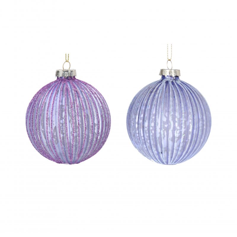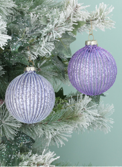 Красива матово люлякова оребрена топка с блясък. Перфектното допълнение към всяко приказно коледно дърво. Гарантирайте си бяла Коледа с тази красива украса. Изработена от стъкло.