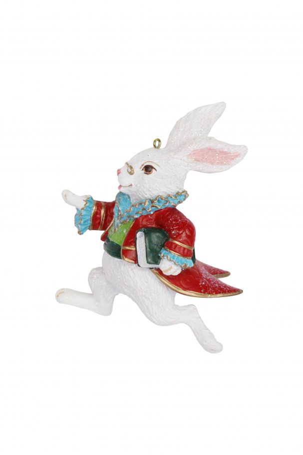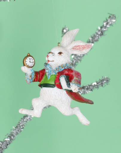 Сладка висяща декорация на Белия заек от Алиса в страната на чудесата. Перфектното допълнение към всяко вдъхновено от приказките коледно дърво. Модерен обрат на класическите декорации. Изработен от смола.