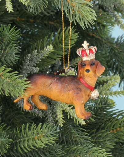 Висяща декорация на дакел с корона със скъпоценни камъни. Царска коледна украса. Изработен от смола.