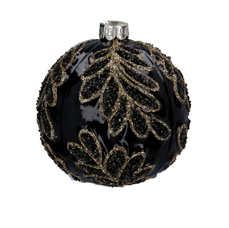 Красива черна топка със златни релефни листя . Перфектното допълнение към всяко черно, червено или златно вдъхновено коледно дърво. Модерен обрат на класическите декорации. Изработен от стъкло.