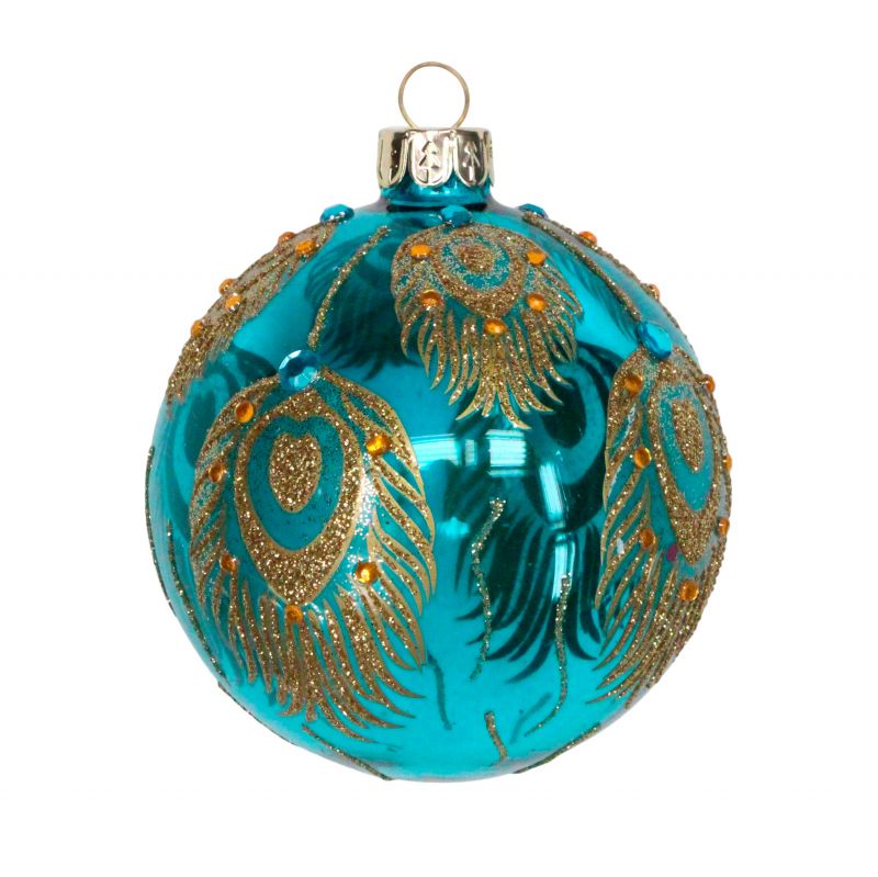 Красива прозрачна тюркоазена топка с златни паунови пера. Чудесно допълнение към всяко коледно дърво. Модерен обрат на класическите декорации. Изработен от стъкло.