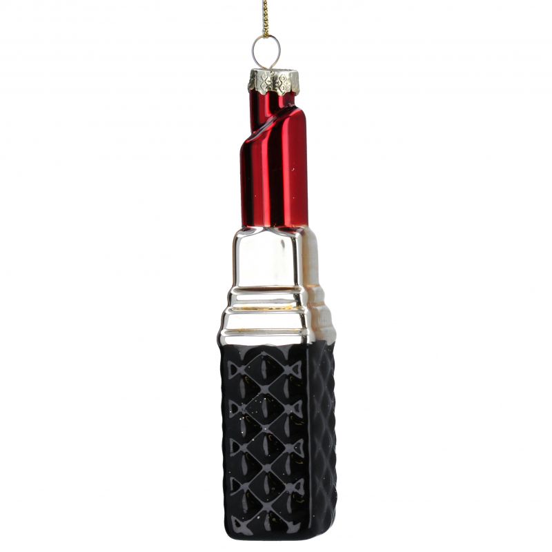 Красива висяща декорация във формата на червило. Перфектният завършек на всяко цветно коледно дърво. Модерен обрат на класическите декорации. Изработен от стъкло.