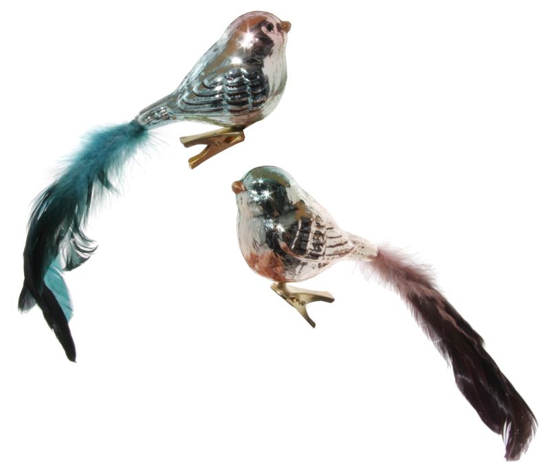 СТЪКЛЕНА ПТИЦА С ЗЕЛЕНИ/ЛИЛАВИ ПЕРА НА КЛИПС