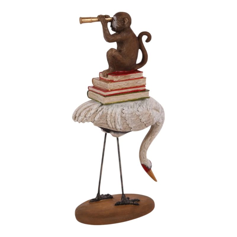 Тази елегантна фигурка изобразява маймуна, седнала грациозно на гърба на голяма бяла птица. Комбинацията от игривата маймуна и внушителната птица създава интригуващ контраст, придавайки на фигурката усещане едновременно за приключение и сила.