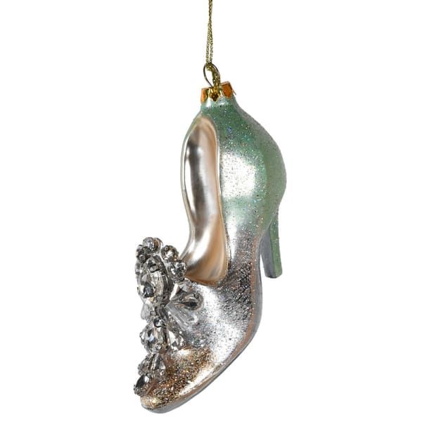 КОЛЕДНА ДЕКОРАЦИЯ ЗЕЛЕНА СТЪКЛЕНА ПАНТОФКА СЪС ЗЛАТЕН БЛЯСЪК